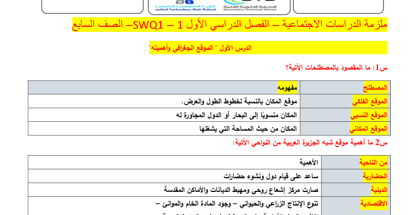 درس موقع شبه الجزيرة العربية وأهميته دراسات اجتماعية للصف السابع الفصل الأول2019