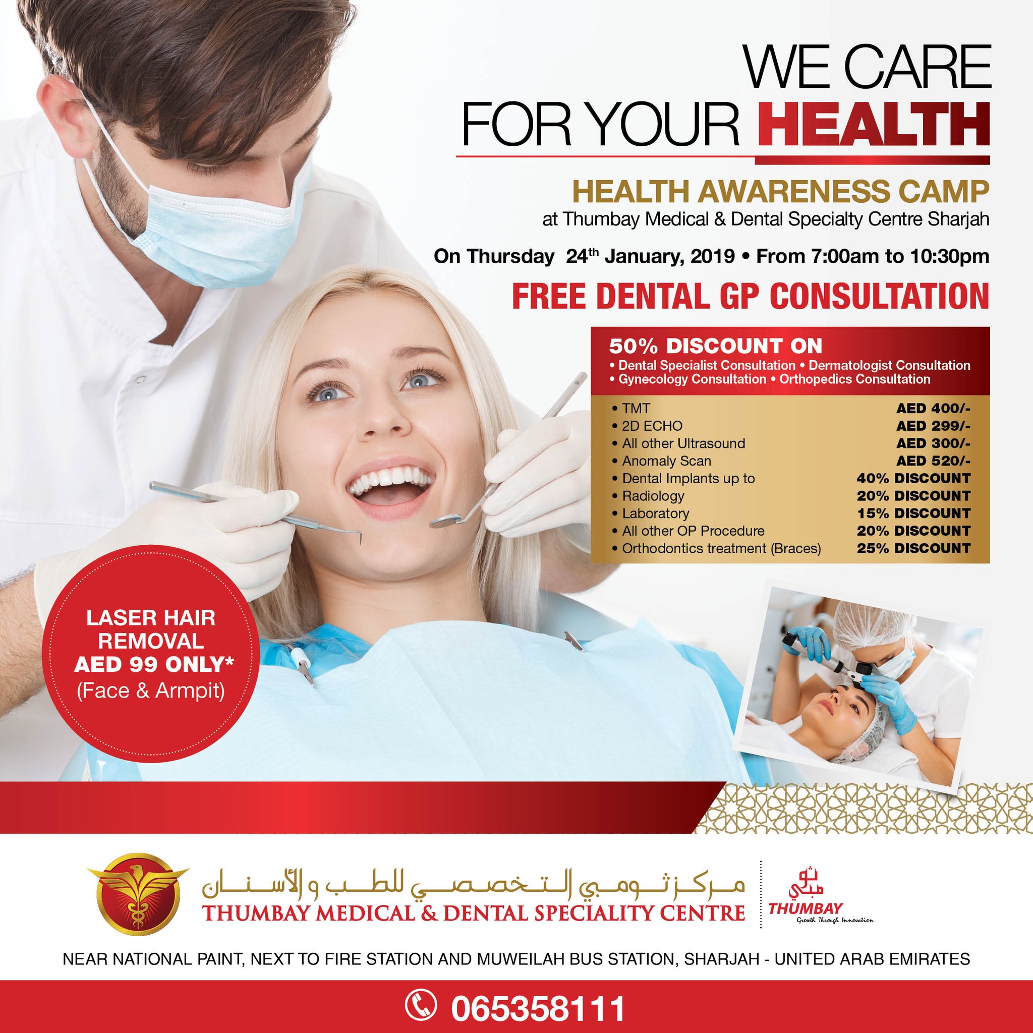 Thumbay Hospital On Twitter Health Awareness Camp At Thumbay Medical Dental Speciailty Centre Sharjah On Thursday 24th January 2019 From 7 00 Am To 10 30 Pm Please Call For Appointments 06 535